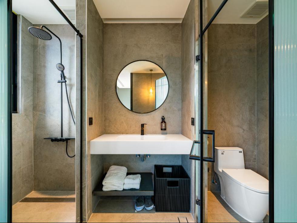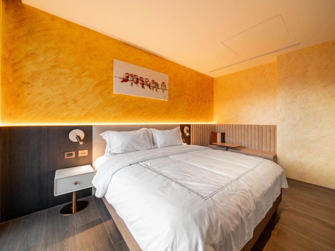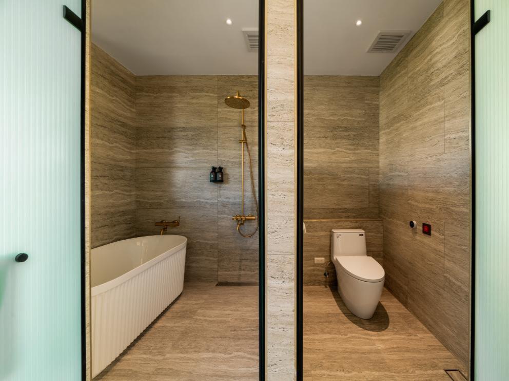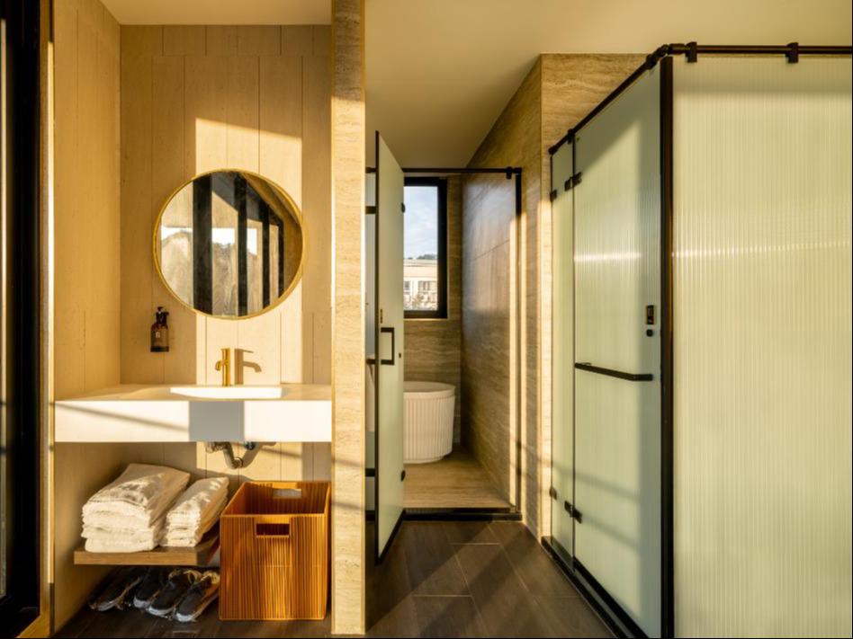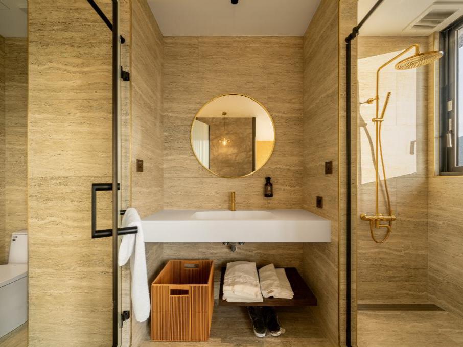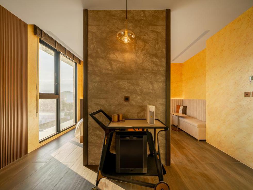 在這個空間裡,我們將九份山城的意象及金瓜石礦山的色澤融合。落地窗將窗外的「山色」引入室內,房內各單品皆為我們用心選品,交織成最美的動態壁畫。