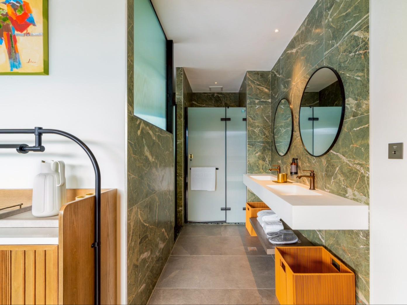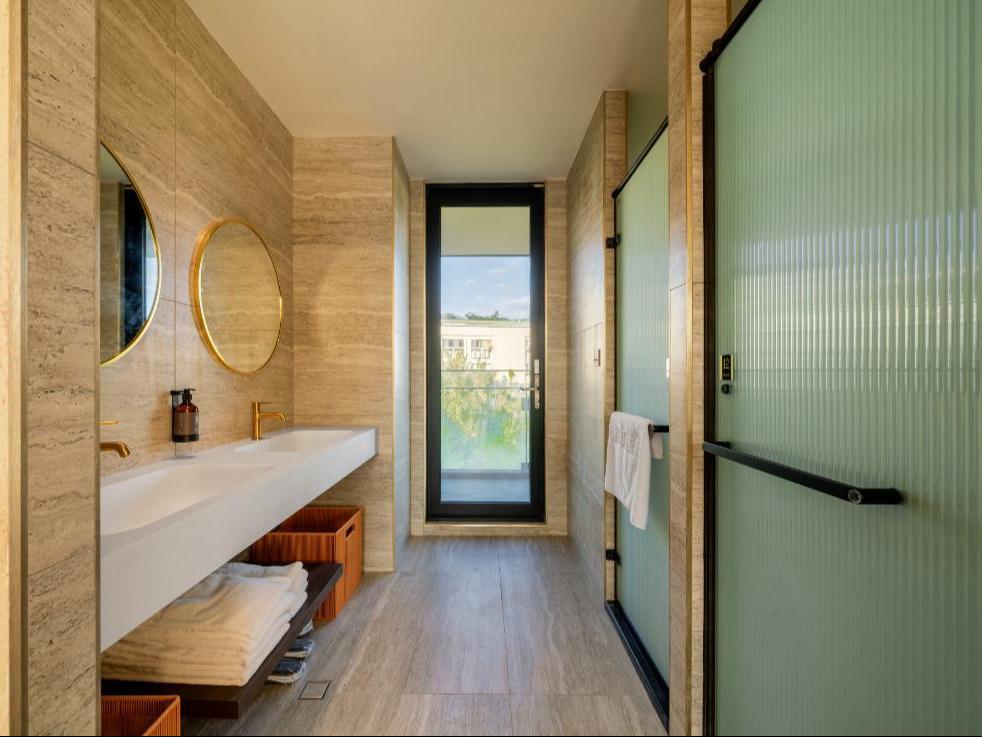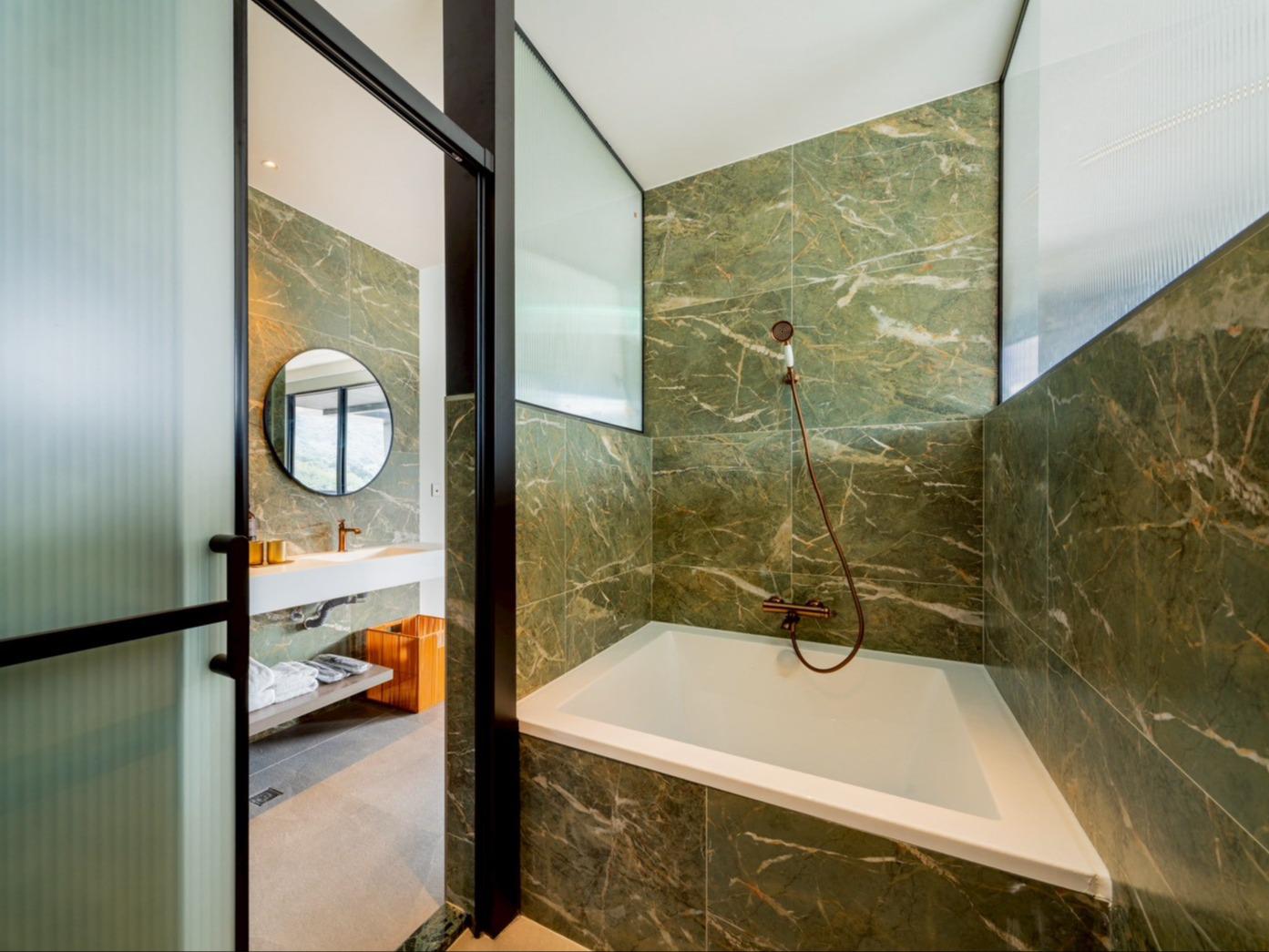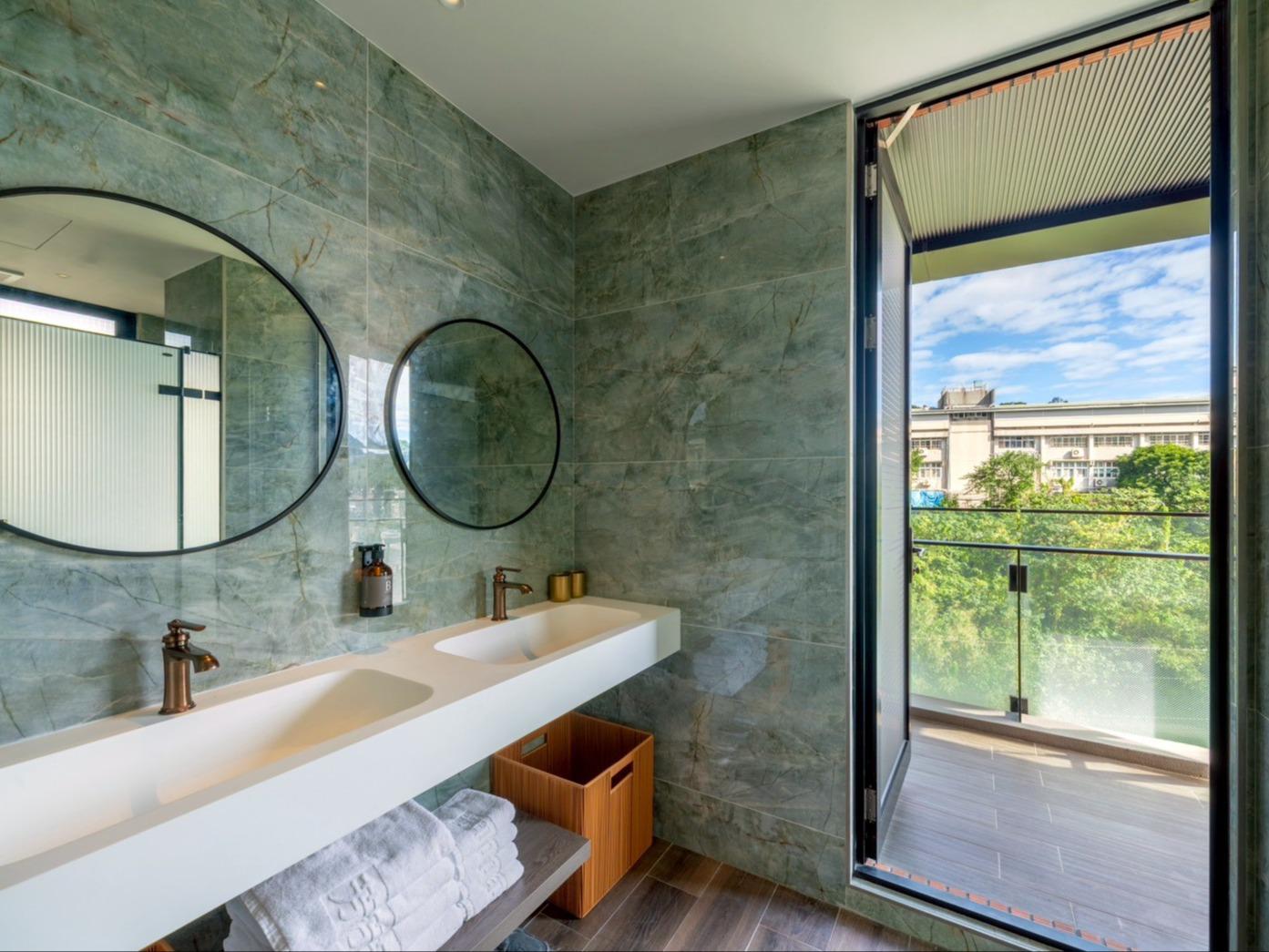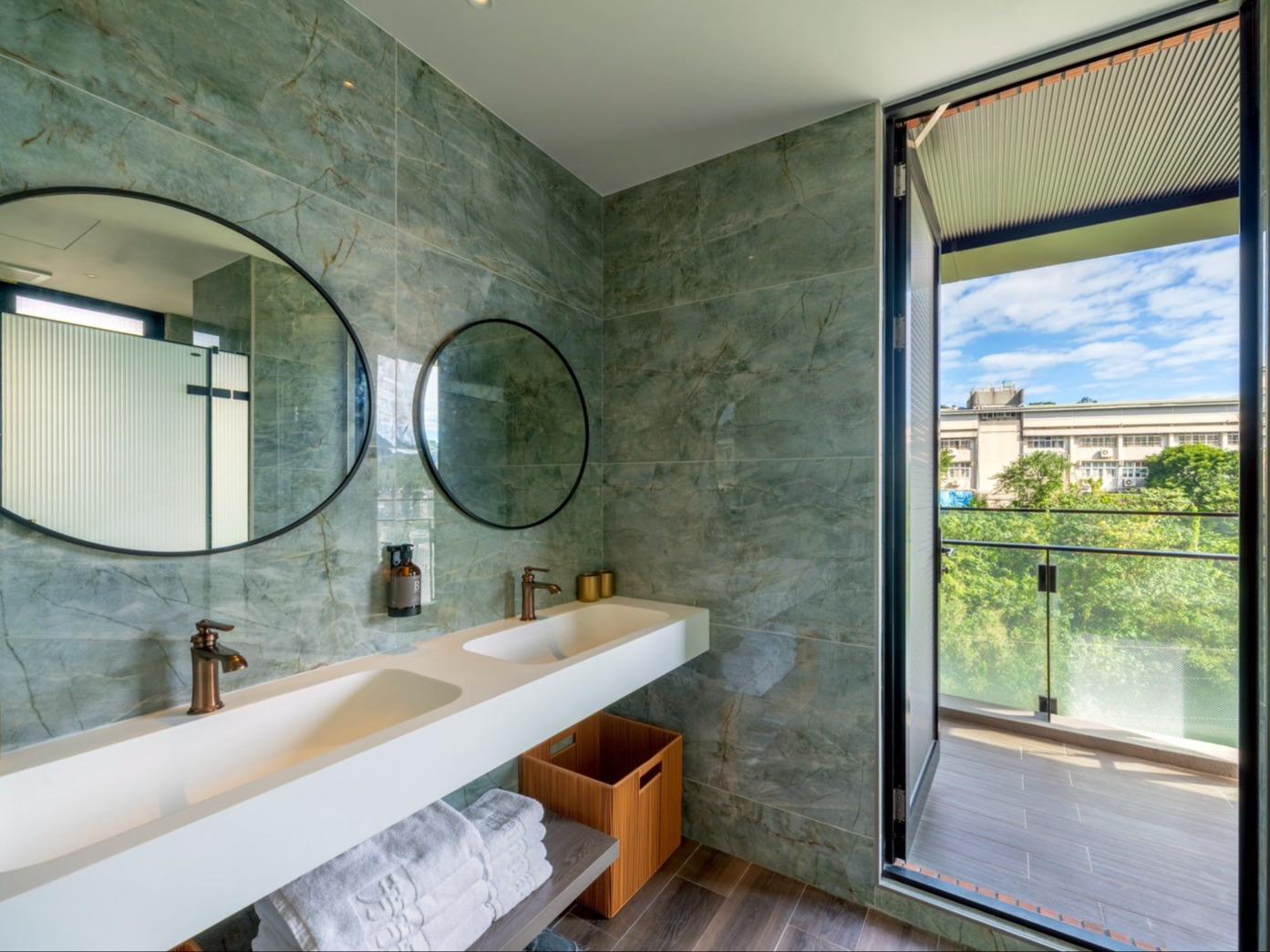 在這個空間裡,我們將九份山城的意象及金瓜石礦山的色澤融合。落地窗將窗外的「山色」引入室內,房內各單品皆為我們用心選品,交織成最美的動態壁畫。