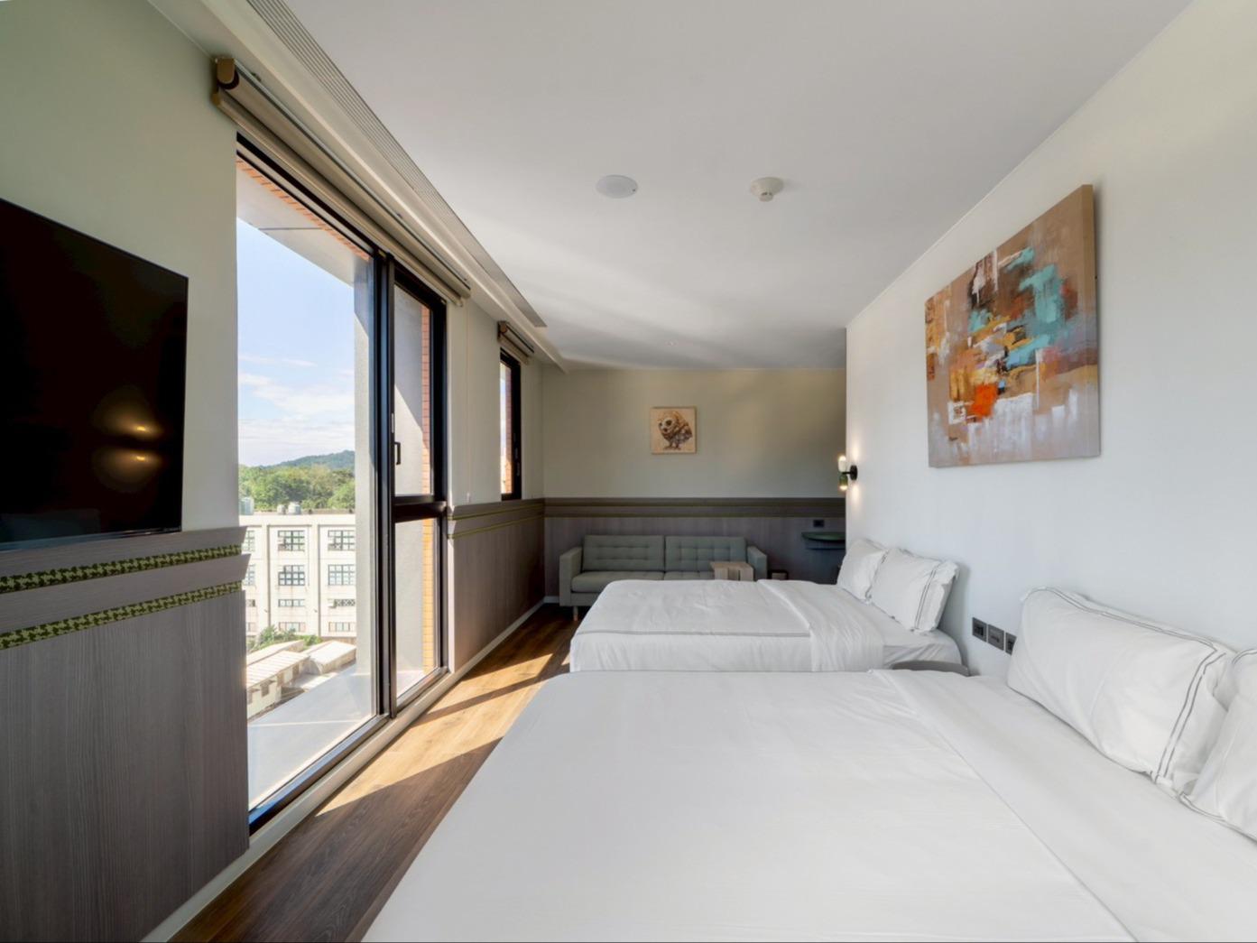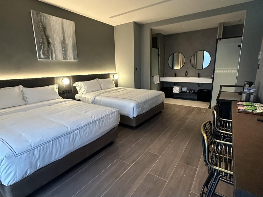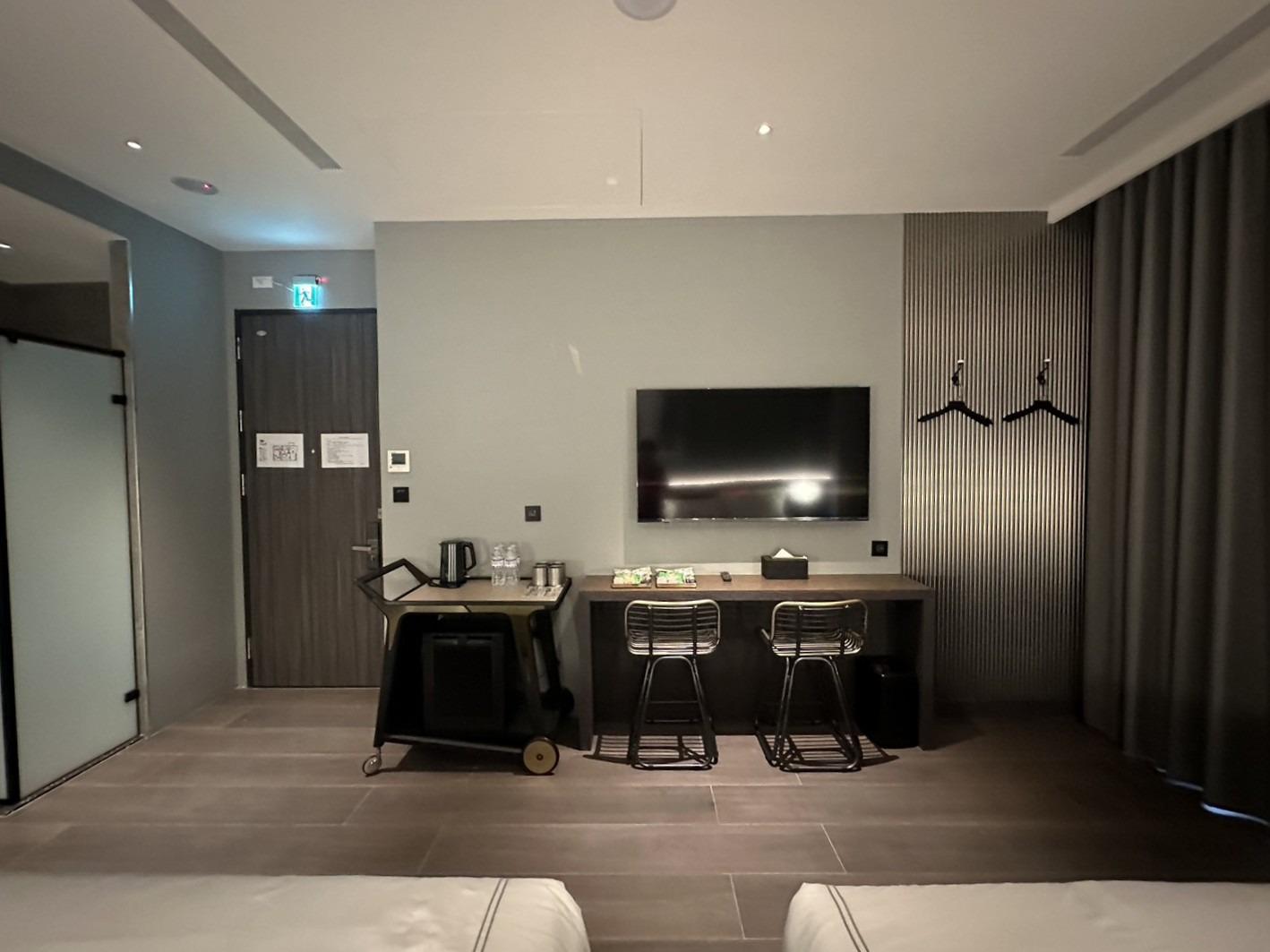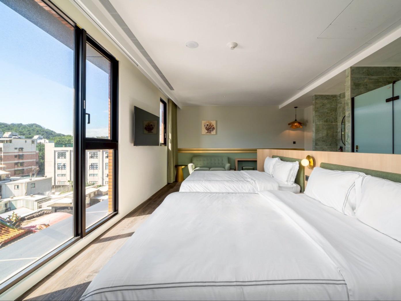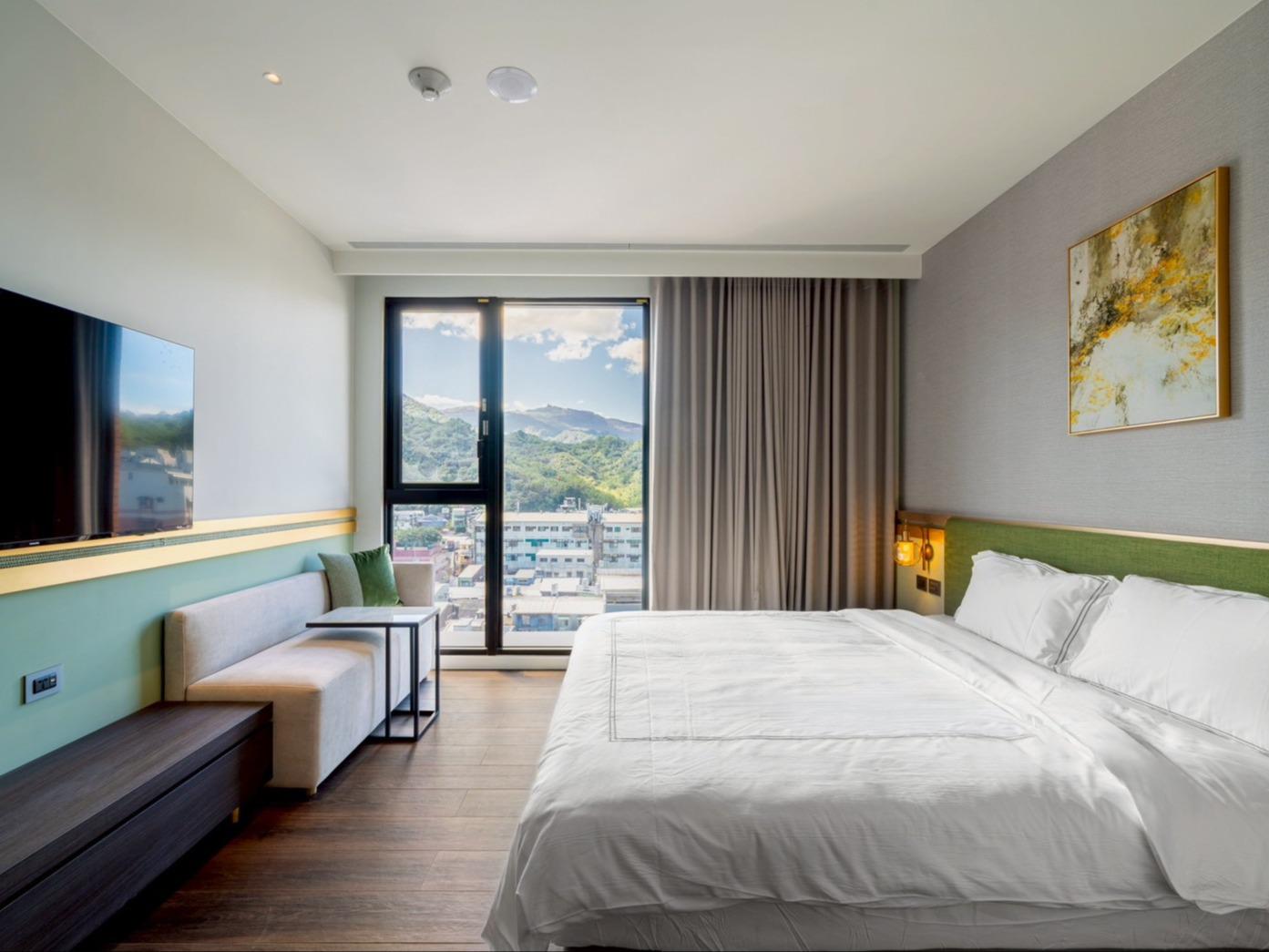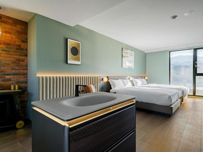 灰色和諧牆面,沉穩而內斂,如同礦石般經年累月所產生的色澤。房內搭配大電視,打造您旅程後放鬆的舒適空間。窗外市景印入眼簾,白日清朗、夜晚安定。木質地板與簡約線條,讓生活回歸純粹。