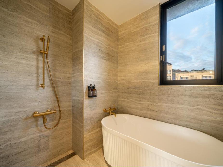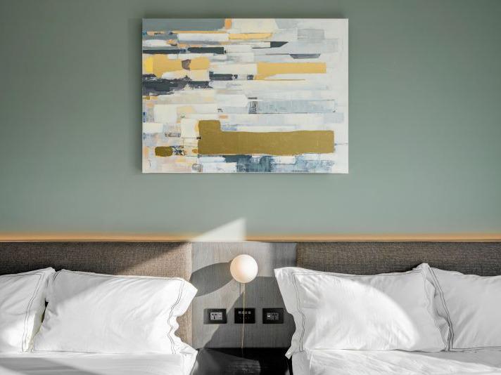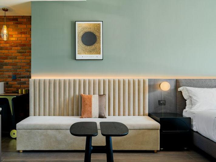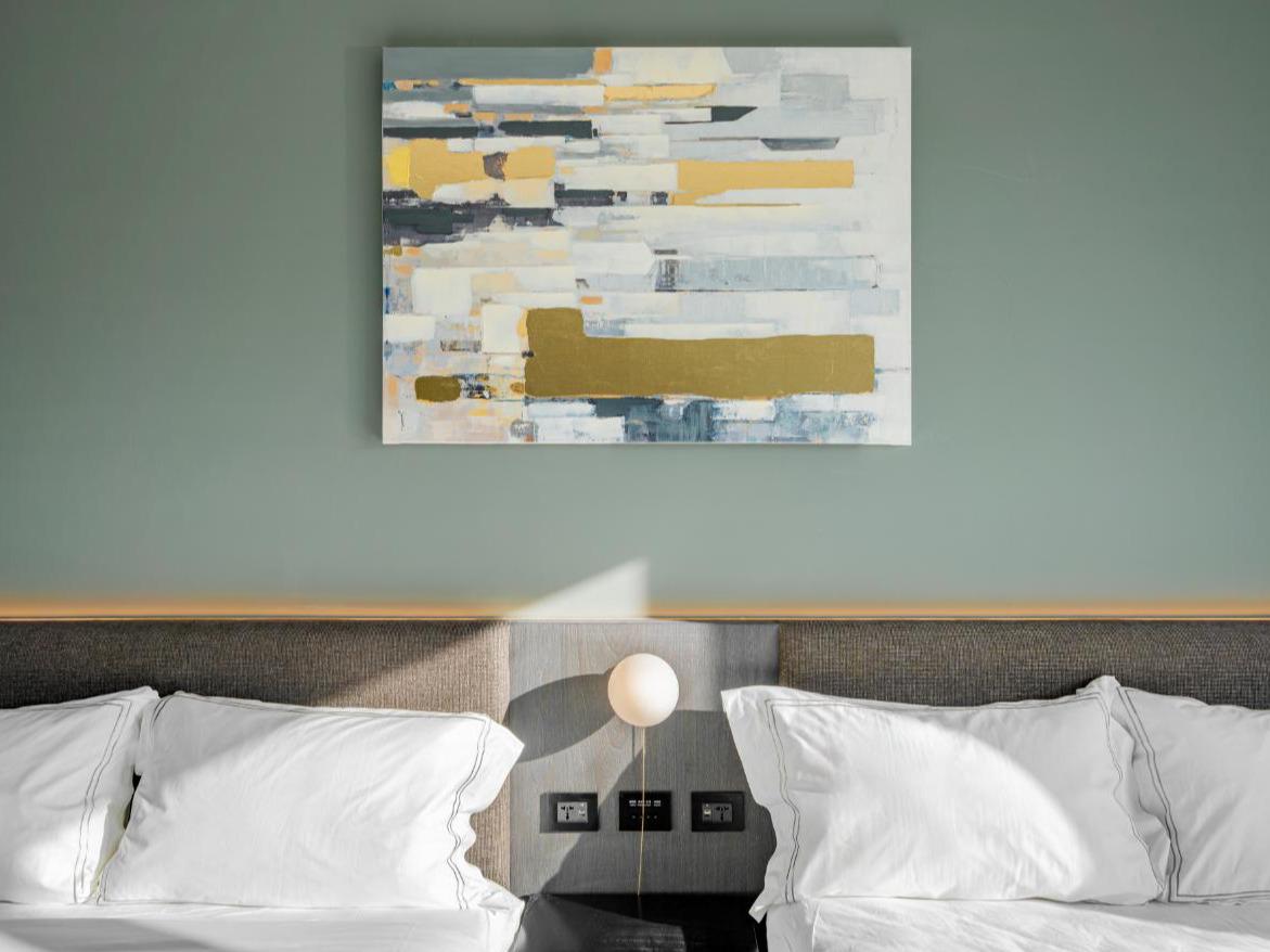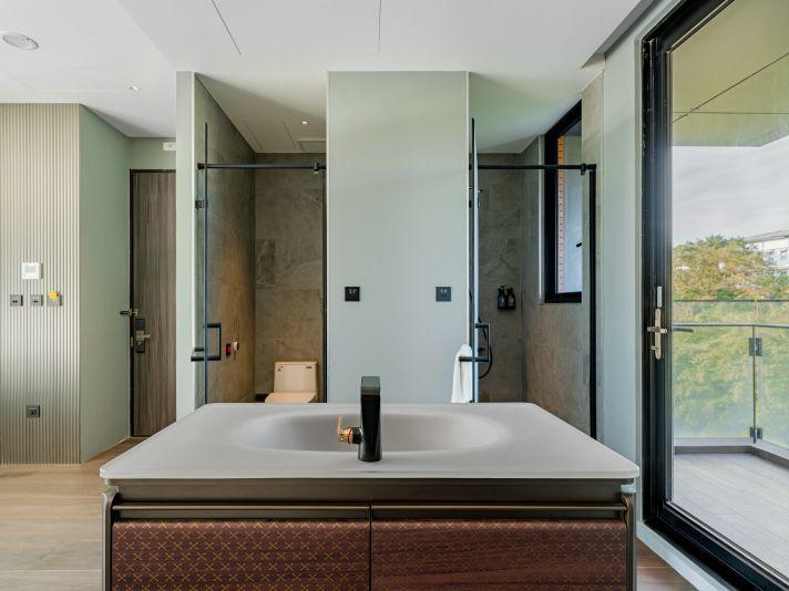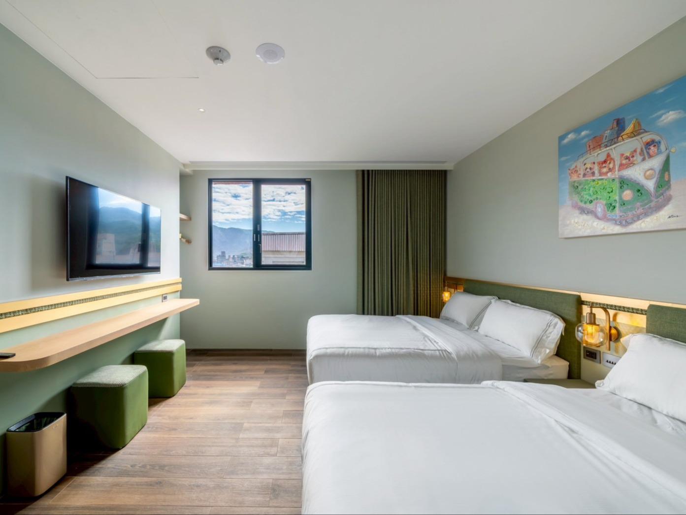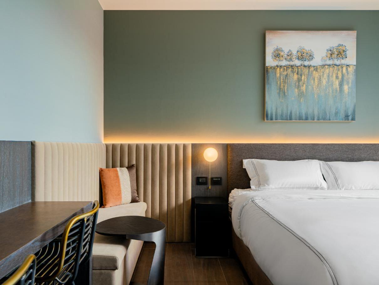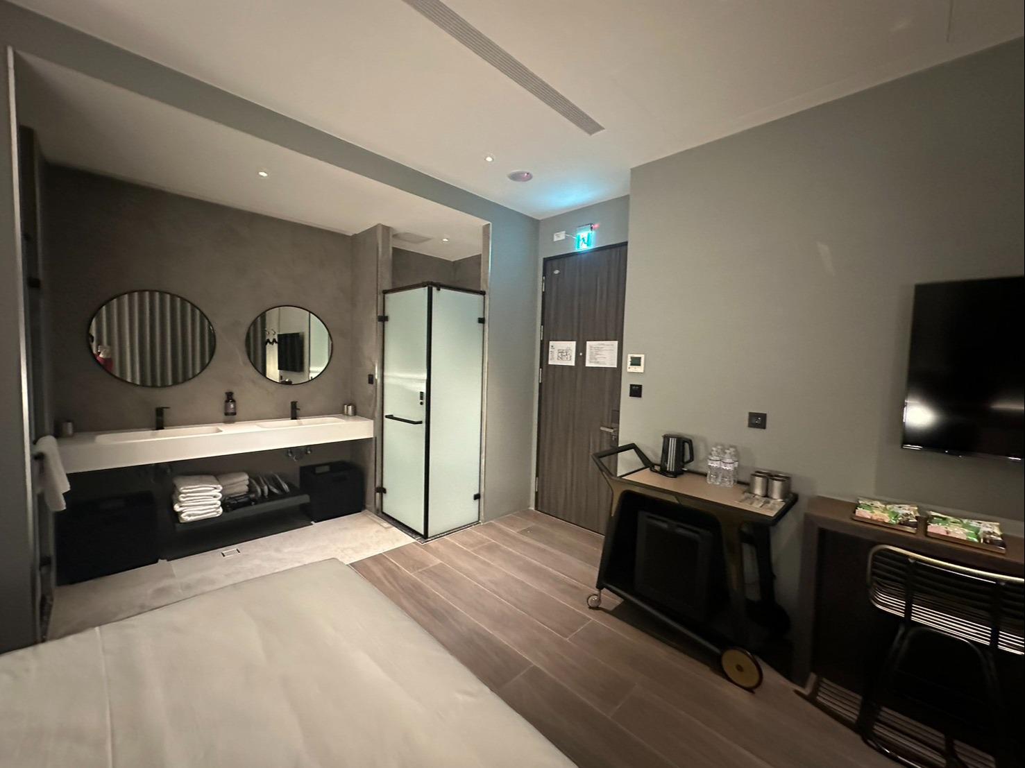 灰色和諧牆面,沉穩而內斂,如同礦石般經年累月所產生的色澤。房內搭配大電視,打造您旅程後放鬆的舒適空間。窗外市景印入眼簾,白日清朗、夜晚安定。木質地板與簡約線條,讓生活回歸純粹。