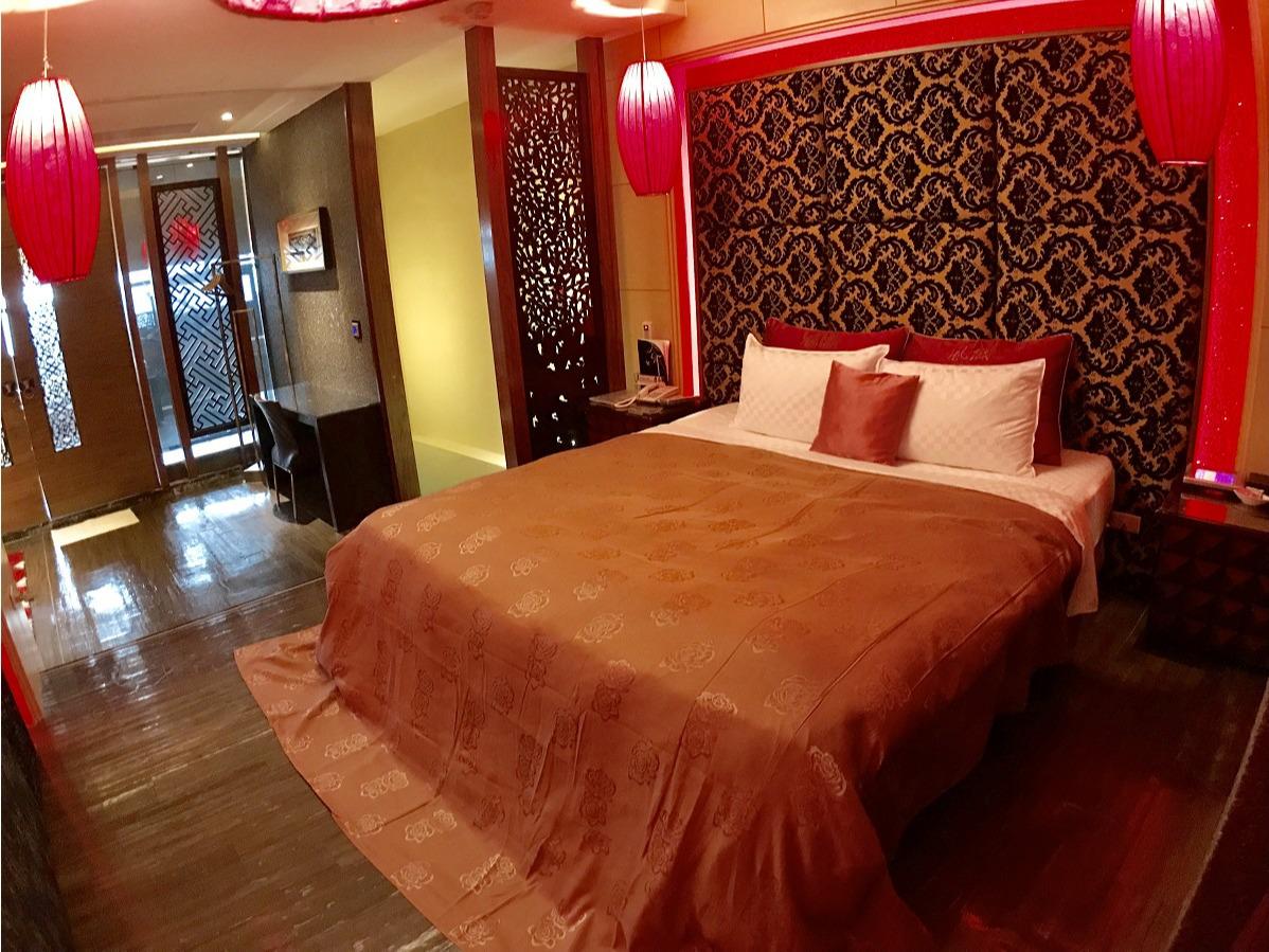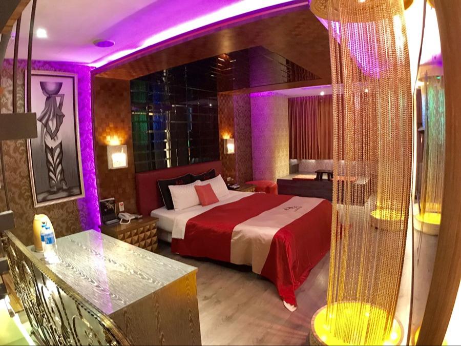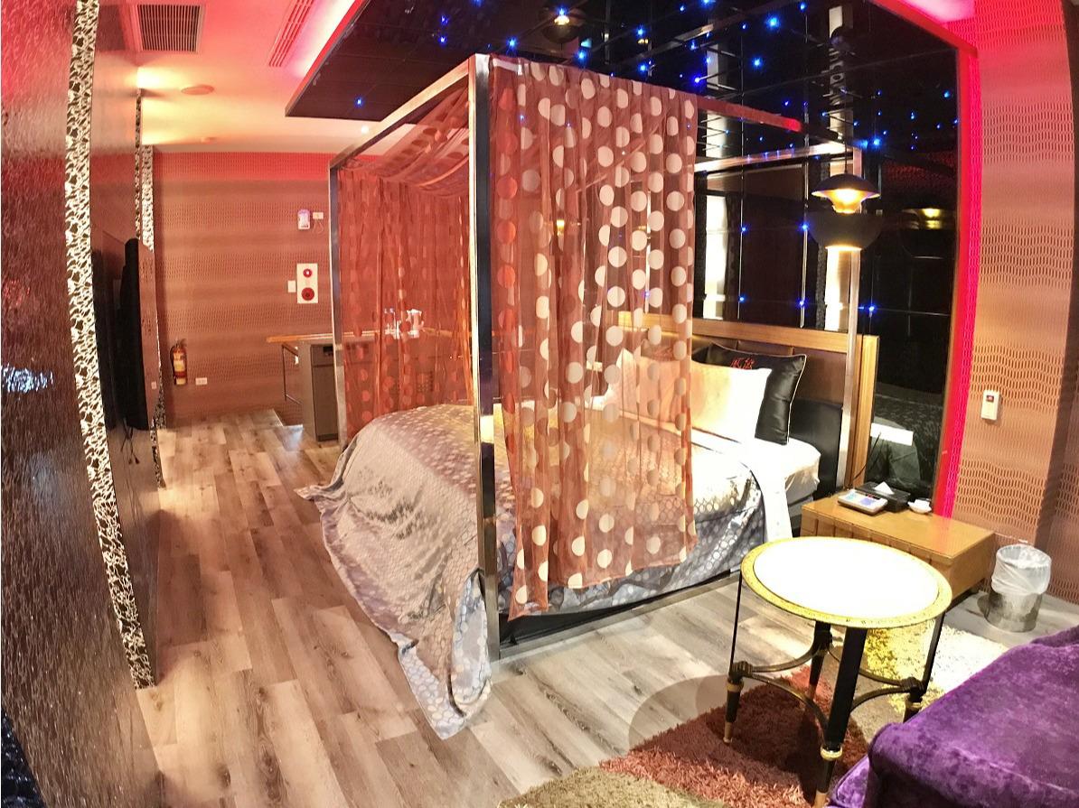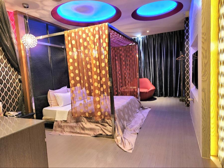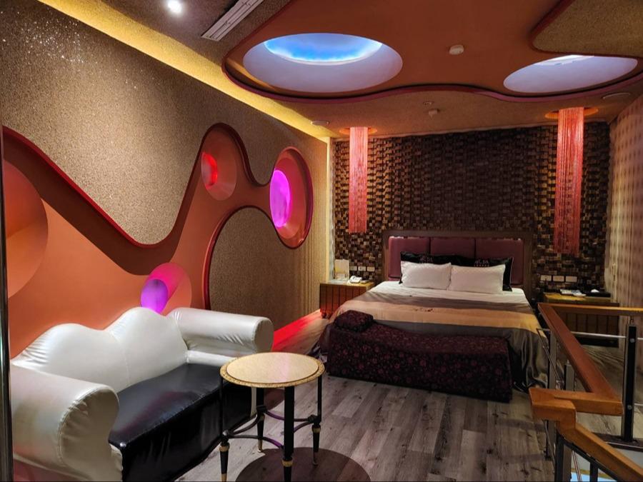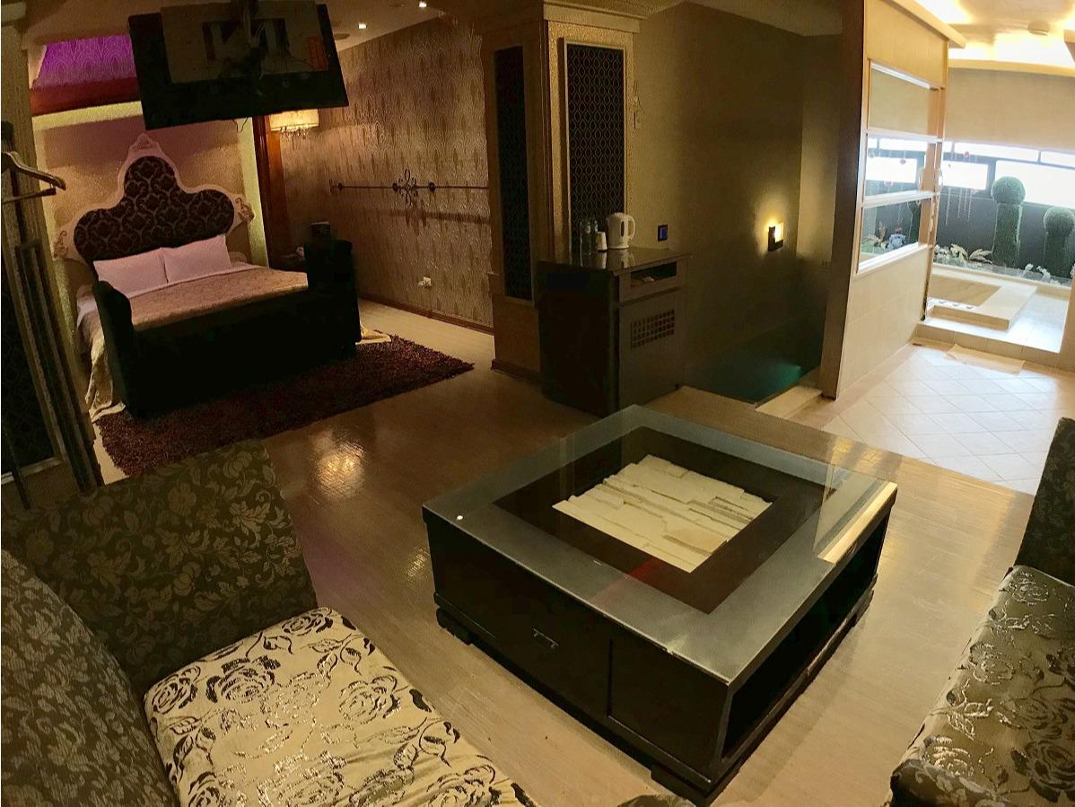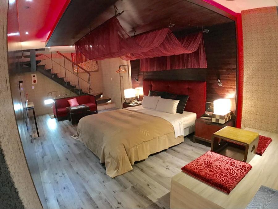 為館內豪華車庫房型,坪數大約16∼18坪,一張特大雙人床,平面房型