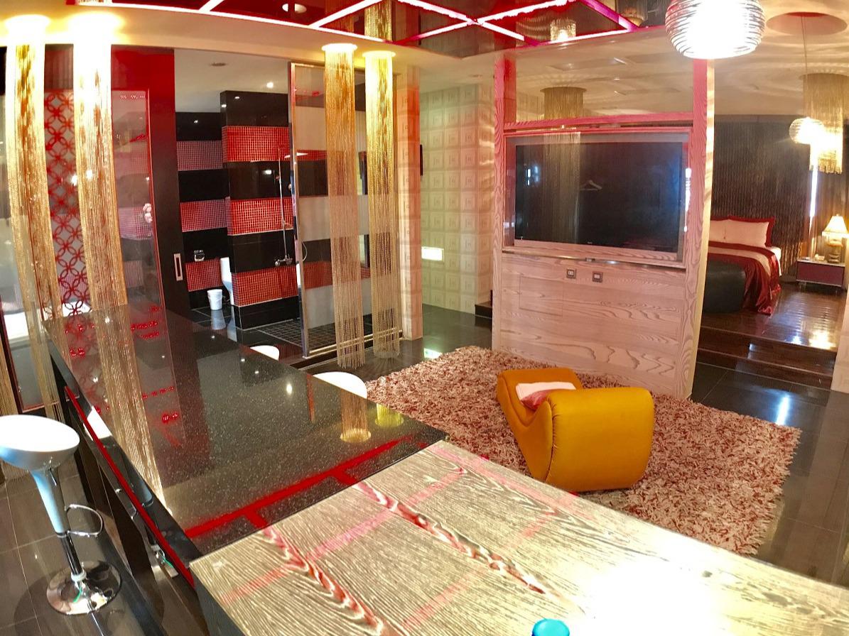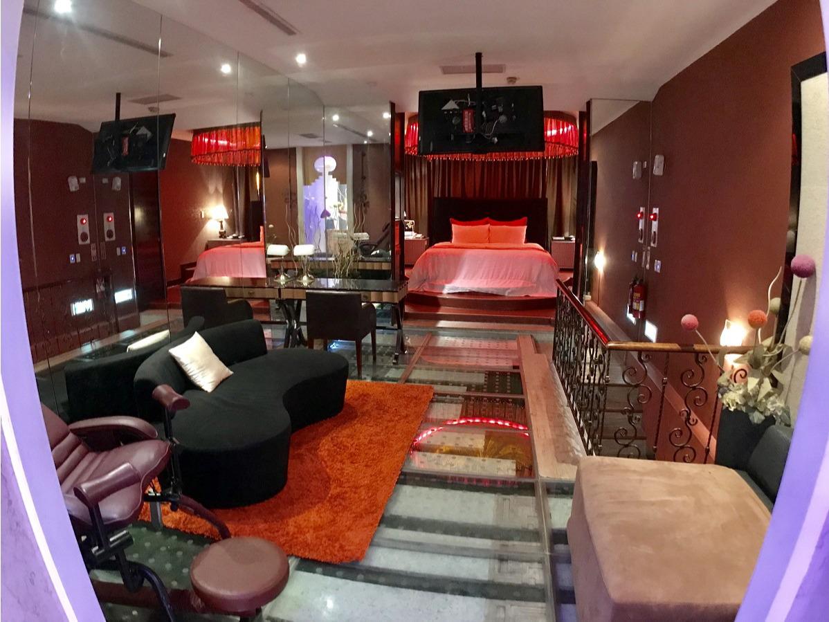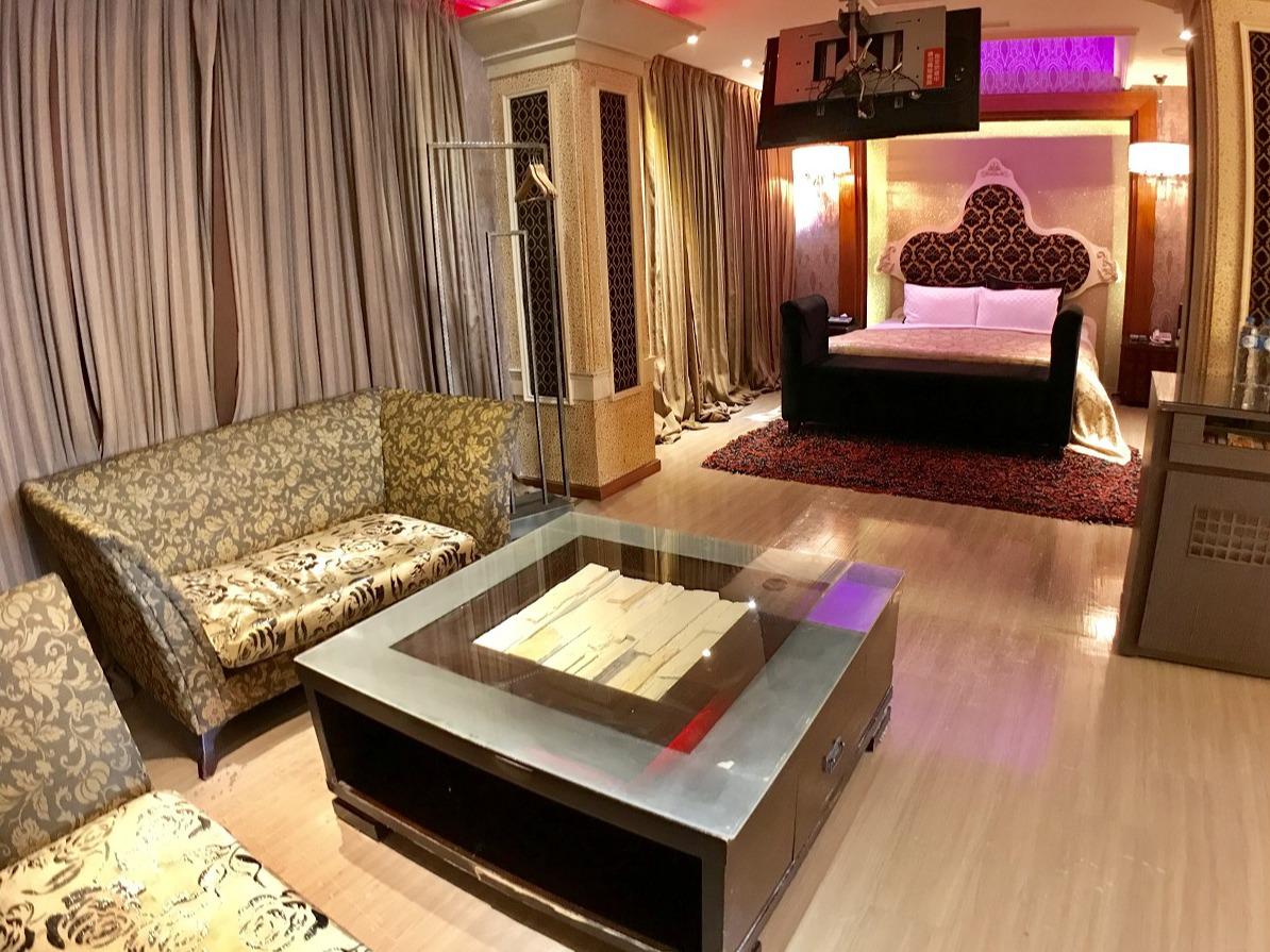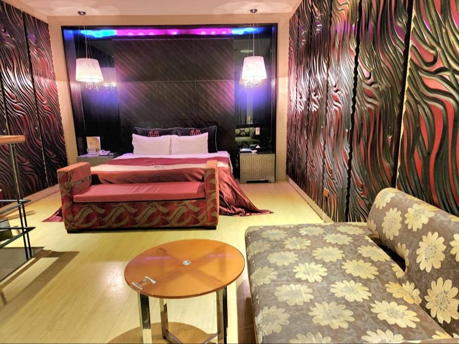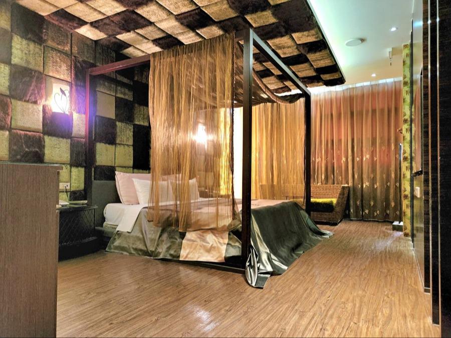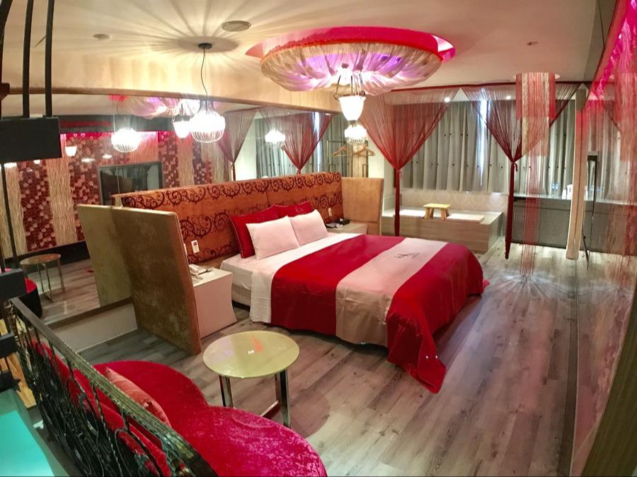 為館內豪華車庫房型,坪數大約16∼18坪,一張特大雙人床,平面房型