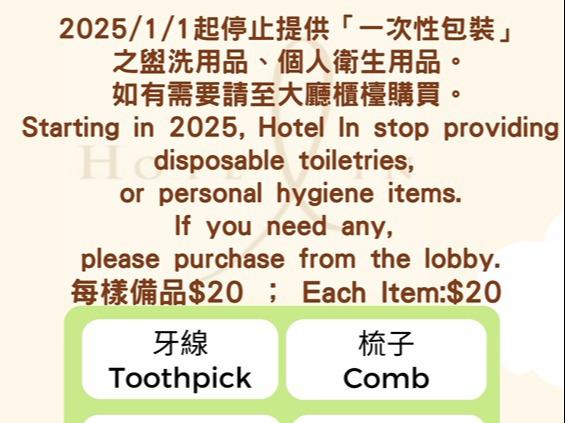 2025/1/1起停止提供「一次性包裝」之盥洗及保養用品、個人衛生用品。如有需要請至大廳櫃台購買。