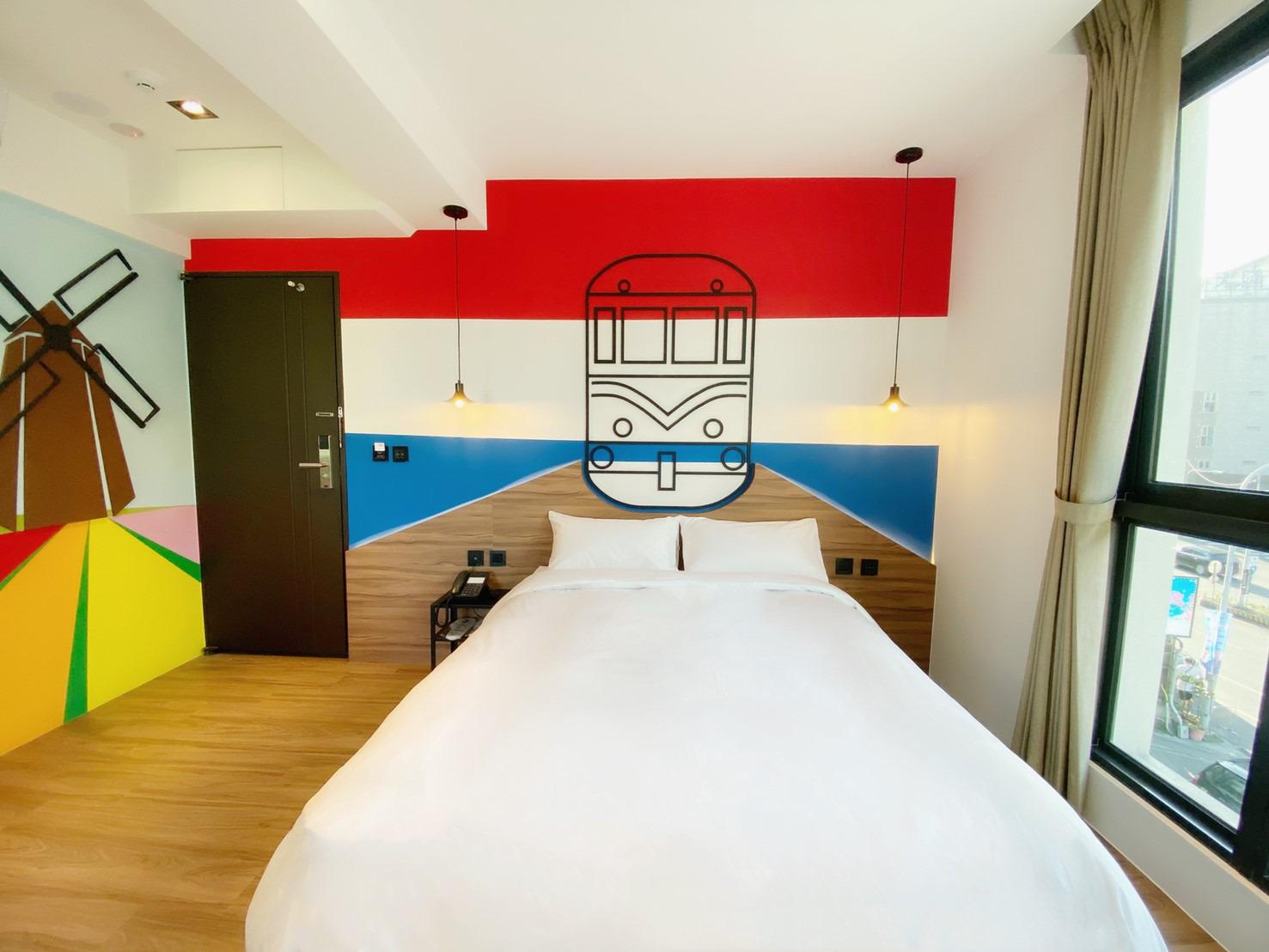 1.風車之國紅白藍色系~風車彩繪~象徵荷蘭特色建構的房型,亮眼鮮豔的顏色給予不一樣度假的新鮮感,大落地玻璃窗外是車水馬龍的街道景觀,浴室採用石材泡湯浴缸,德國優客乳膠床墊使您一夜好眠