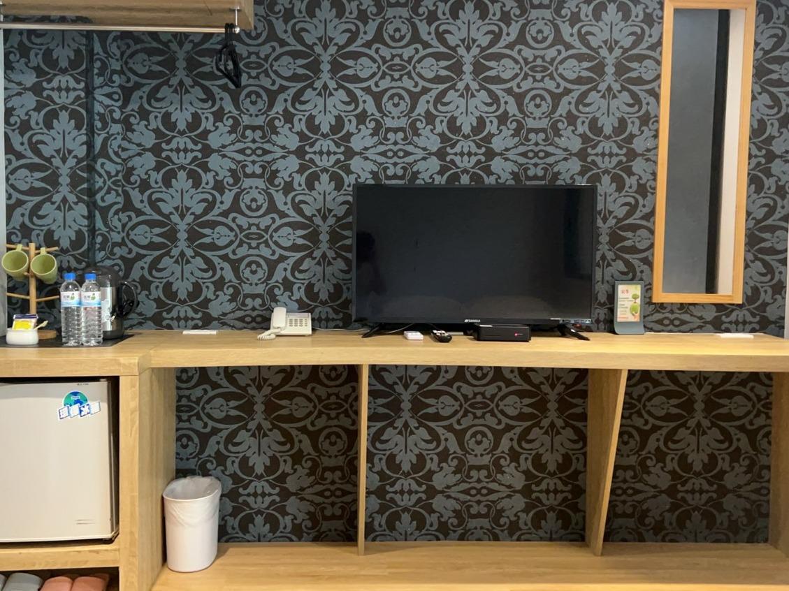 一大床的規劃,包含電視.冰箱.燒水壺,並提供咖啡及茶包,