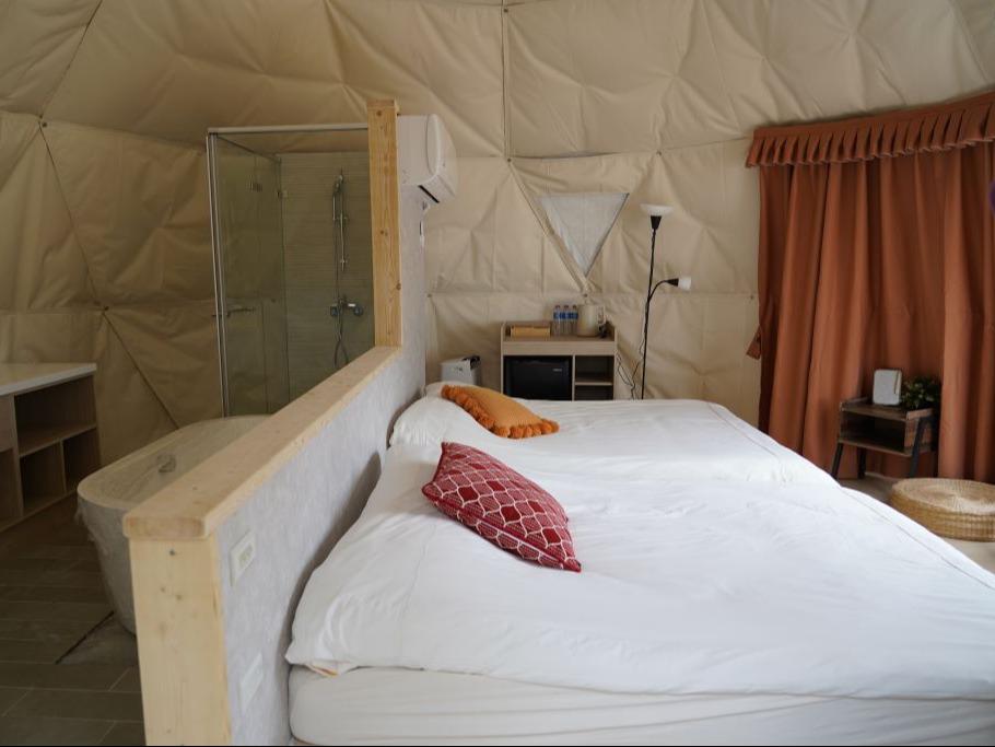 ✦車內含舒適雙人床及乾濕分離衛浴,冷暖空調、冰箱、水壺、吹風機、鞋架、木製小桌、溫馨小夜燈、飲用水、衛生紙、沐浴乳、洗髮精等服務設施。